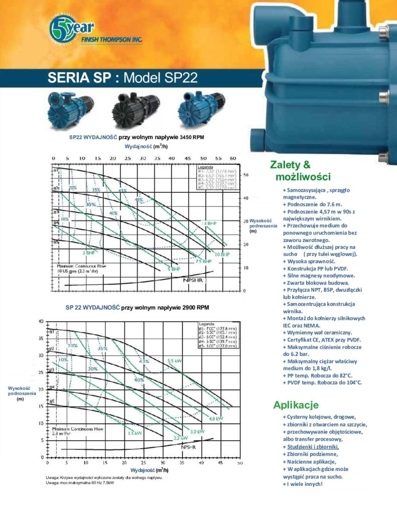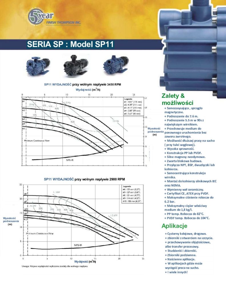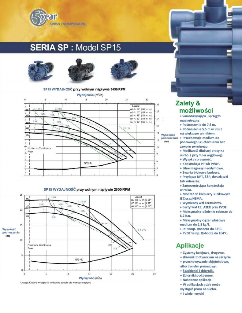 - Moc – wyjątkowa konstrukcja pompy SP umożliwia wytworzenie bardzo dużego podciśnienia po stronie ssącej. Podciśnienie to pozwala podnieść medium z wysokości 7,6 m poniżej poziomu pompy. Ten parametr oraz wysokie ciśnienie tłoczenia sprawiają, iż pompy SP doskonale sprawdzają się w przypadku mediów o dużym ciężarze właściwym (np. kwas siarkowy, kwas fosforowy, zasada sodowa i potasowa).